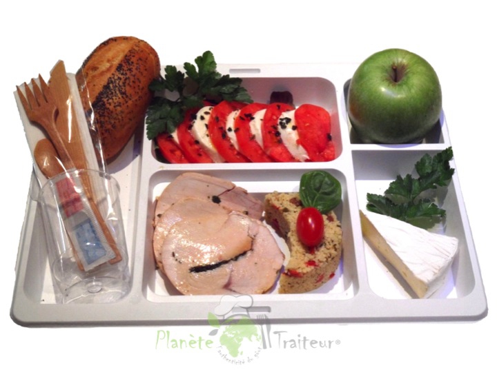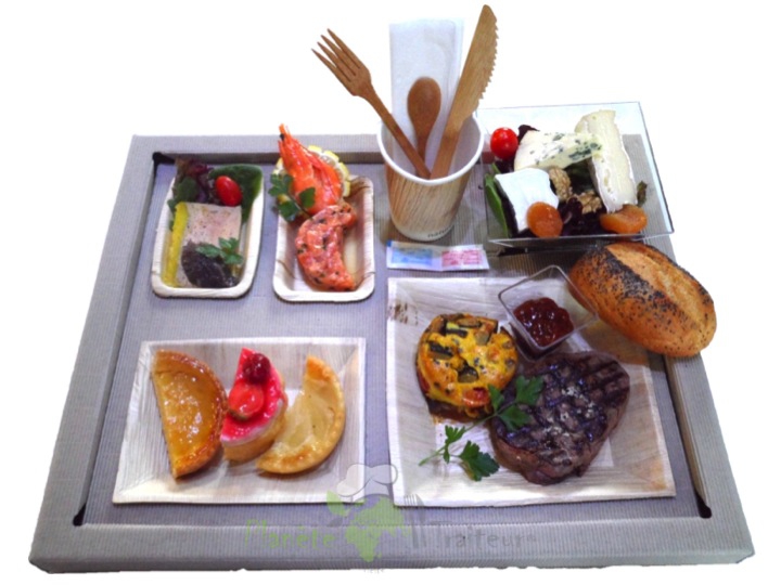 Tous nos repas sont servis dans un élégant coffret avec un pain individuel, un set de couverts, une serviette.