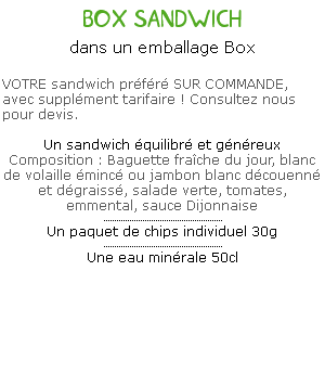 Possibilité de commander vos coffrets repas et Box sandwich la veille jusqu’à 17h.